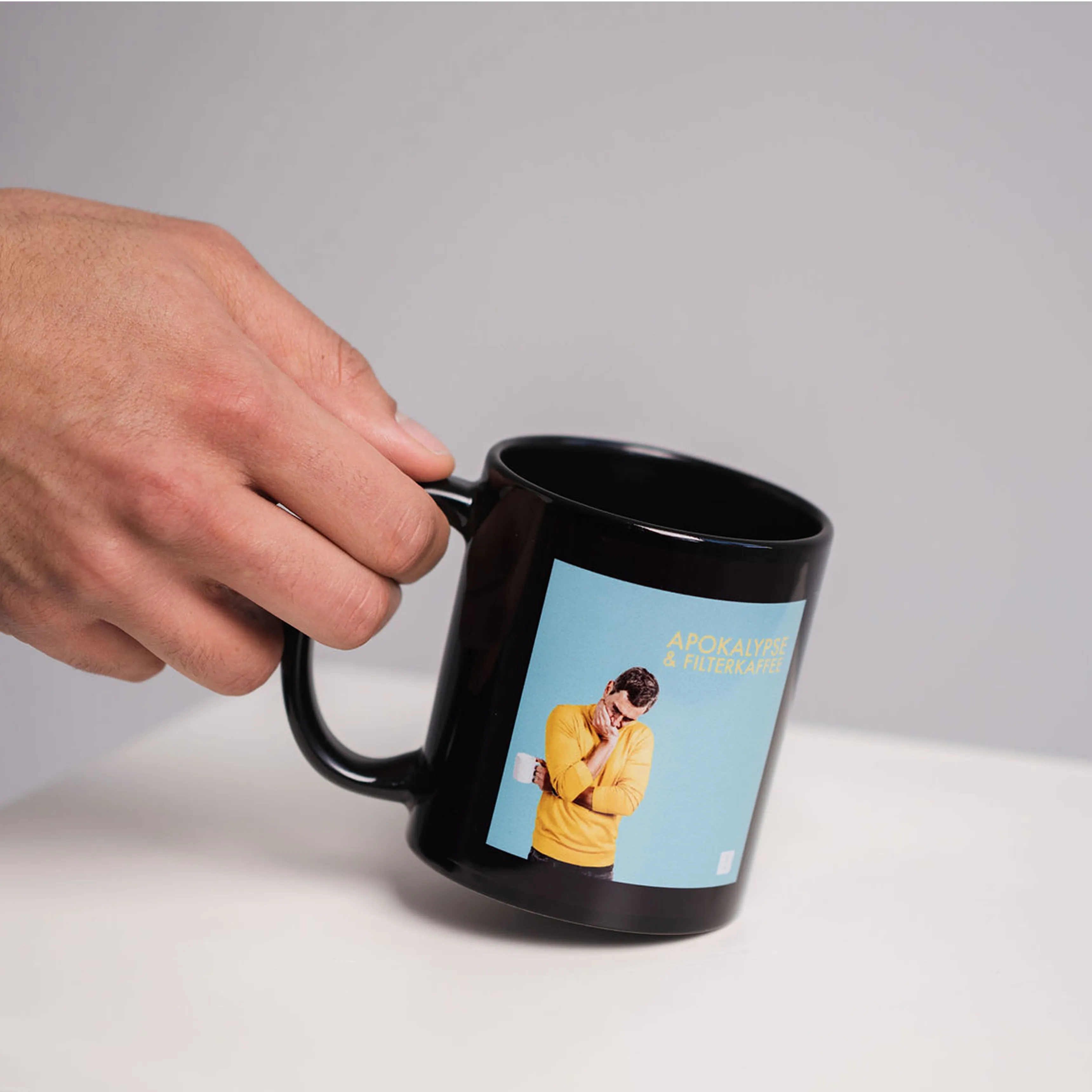 Schwarze Tasse mit dem Apokalypse und Filterkaffee Cover auf beiden Seiten.